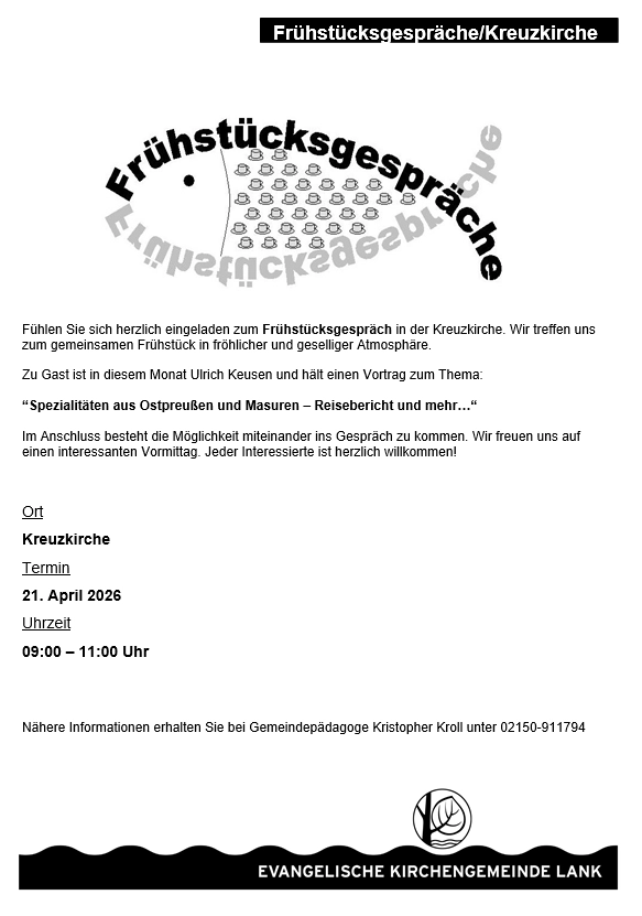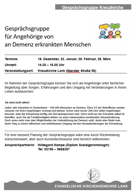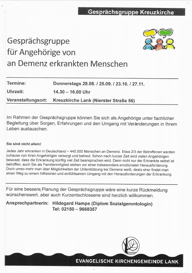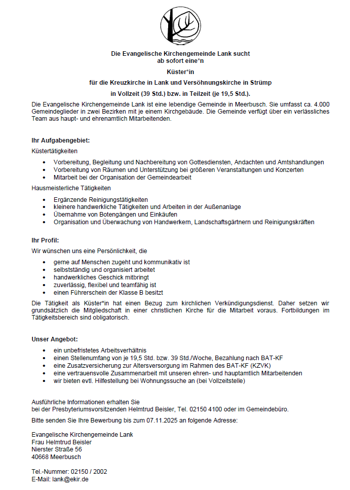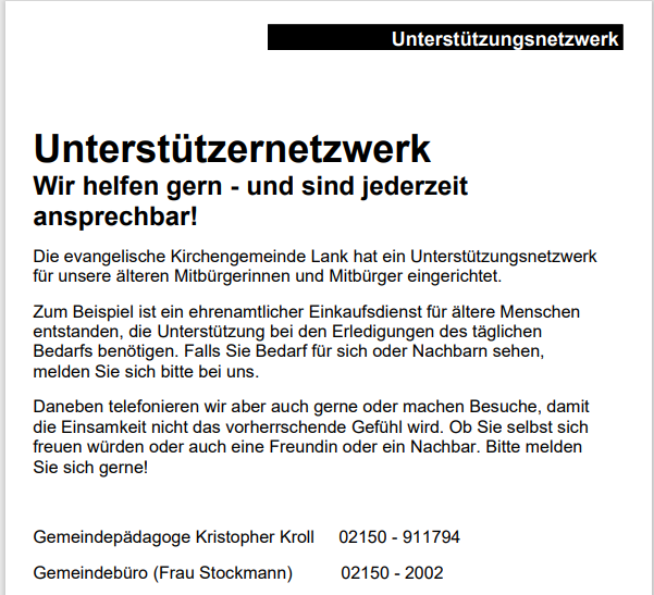 Die Stiftung hat sich zur Aufgabe gemacht, die kirchlichen und diakonischen Aktivitäten der Evangelischen Kirchengemeinde Lank finanziell zu unterstützen und langfristig abzusichern. Durch die Erträge des Stiftungskapitals, das nicht angegriffen werden darf, und die Spenden vieler Gemeindeglieder werden die Erwachsenen- und Jugendarbeit sowie die Seniorenarbeit und die Kirchenmusik gefördert. Zwei Möglichkeiten der Unterstützung: