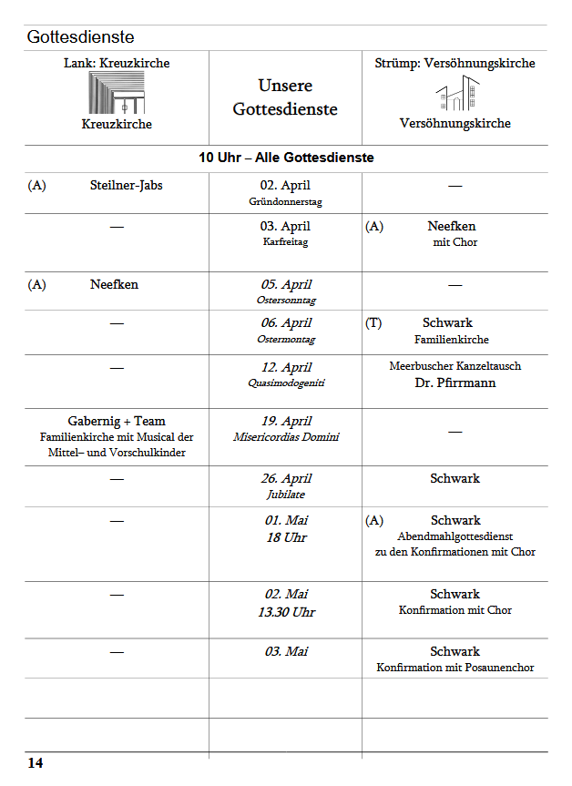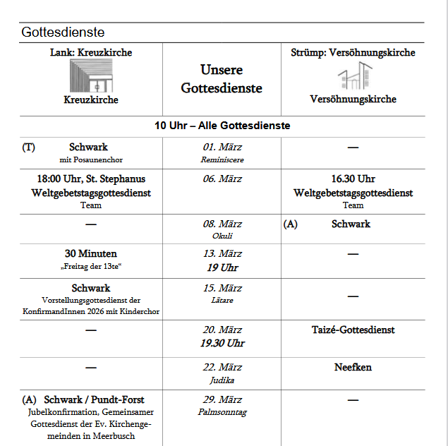 Telefon: 02150 2002Nierster Str. 5640668 MeerbuschÖffnungszeiten:Mo - Do. 9-12 Uhr Do. 15-17 Uhrgemeindebuero@evangelisch-lank.de